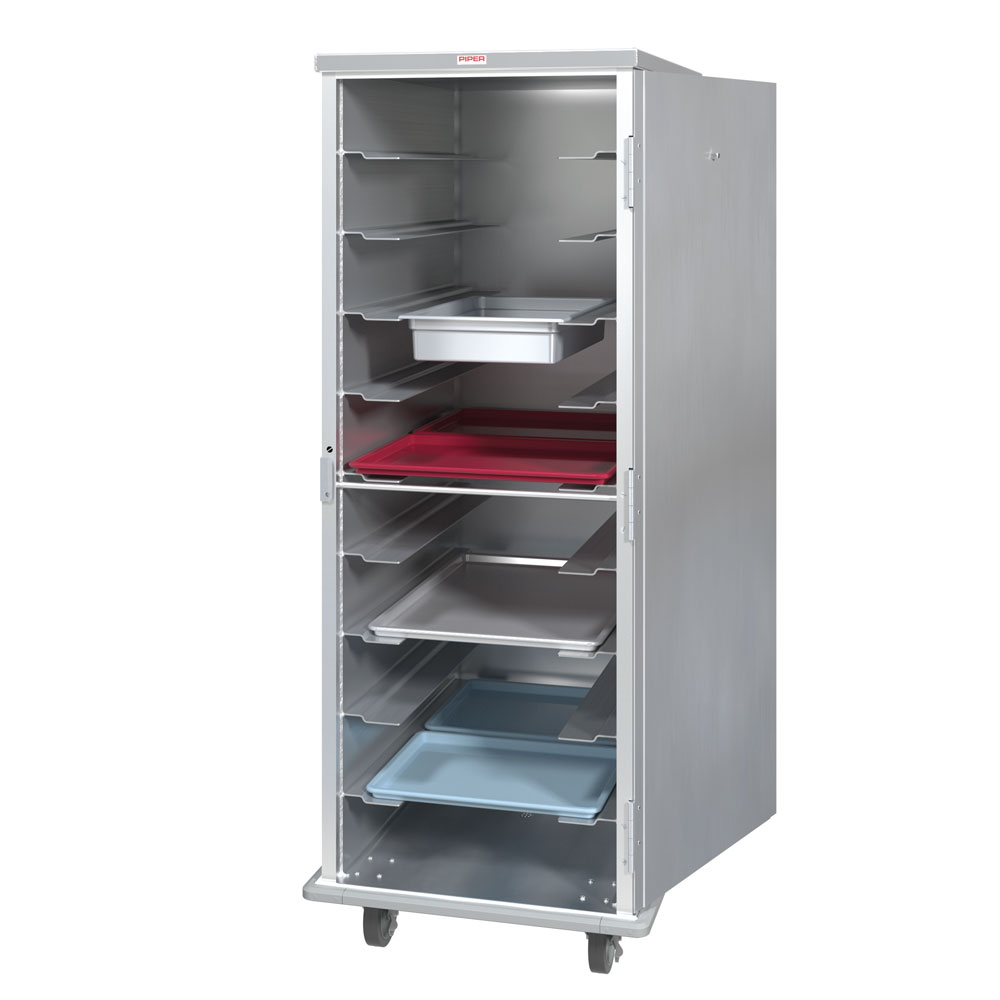 Piper Aluminum Delivery Carts feature fully welded construction to withstand years of meal tray delivery. Standard features include push handle, drain, 270 degree door swing, heavy-duty casters and rolled edge to act as a bumper.