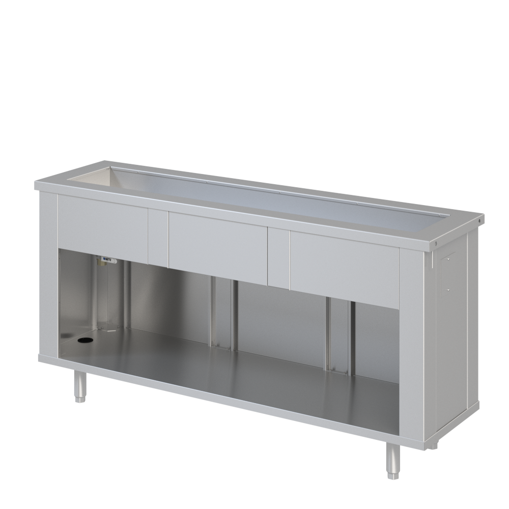 - Framing includes 14-gauge top fastened to 14-gauge corner posts fastened to 14-gauge caster channels fastened to 18-gauge stainless steel bottom shelf, open control side