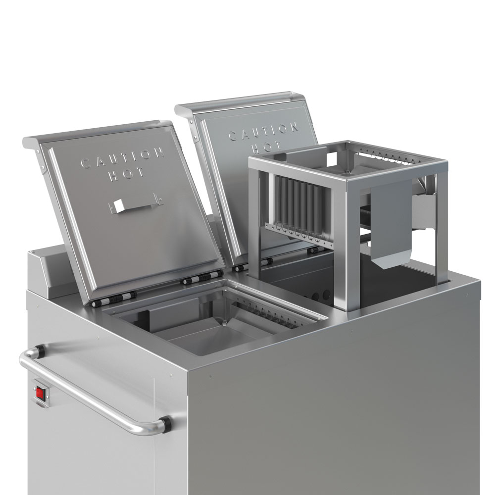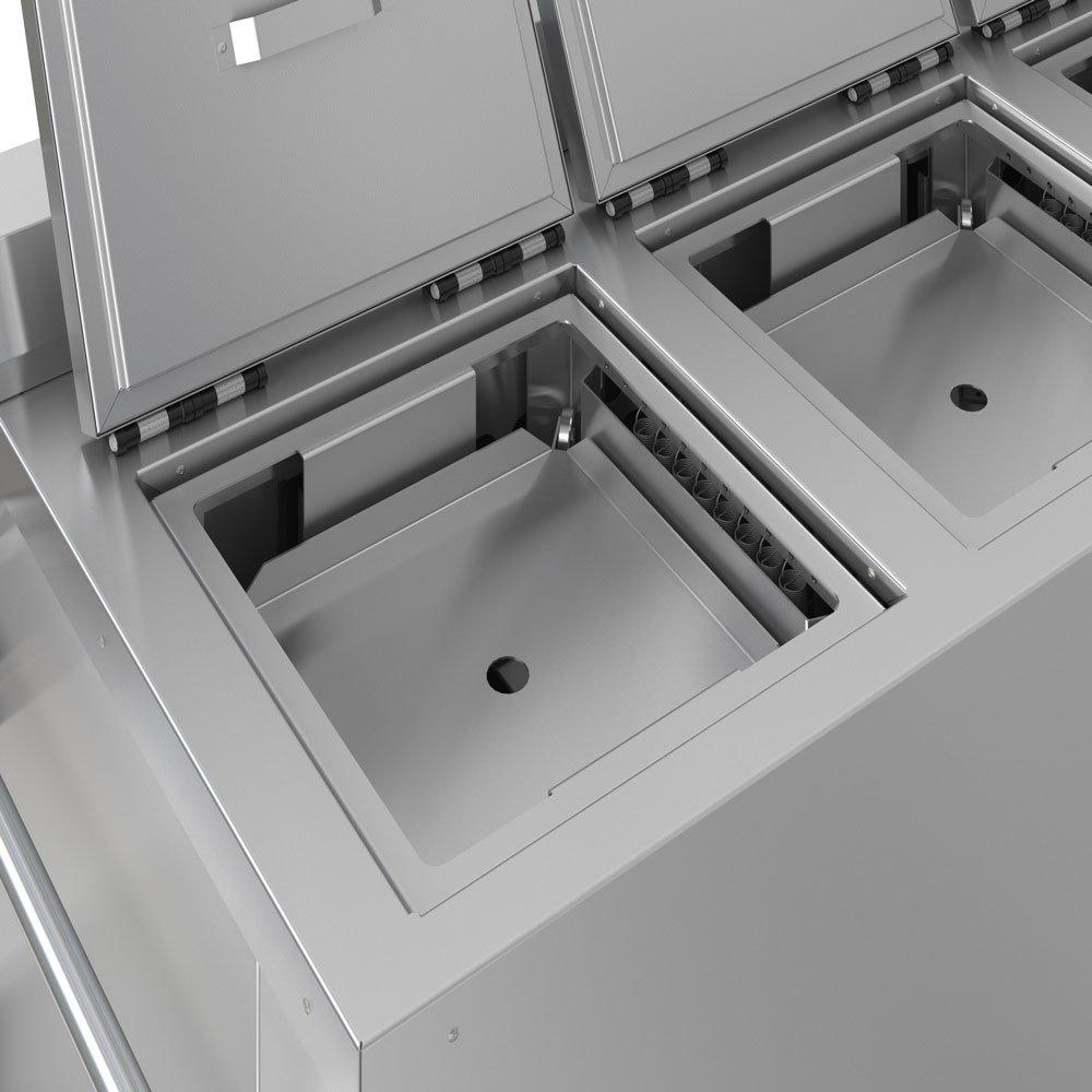 The fully insulated lids shall be constructed from 16-gauge stainless steel with a gasketless design. Lids have no hinges and can be hung on brackets during operation.