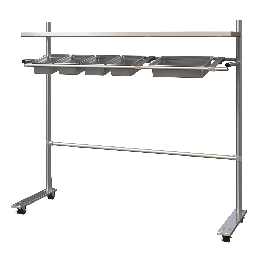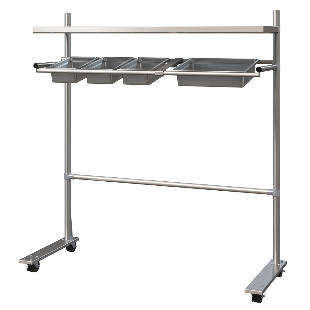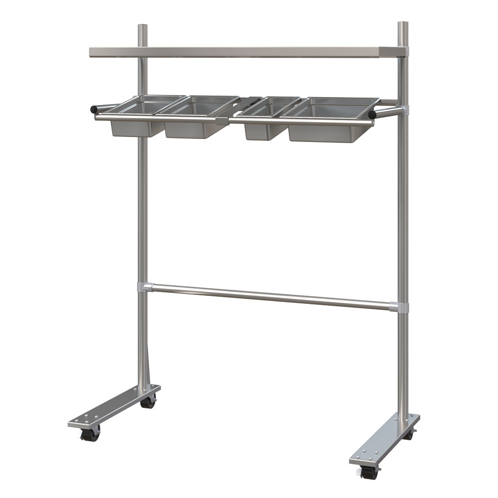 Piper Starter Stations straddle, roll adjacent to, or cantilever over patient meal assembly tray lines or work areas. They are designed to provide a convenient, organized method of storing and/or dispensing those basic items necessary for the commencement of patient meal assembly.