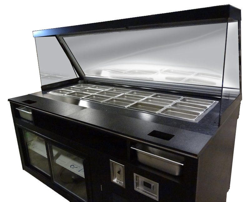 The Sandwich/Food Prep Case has a lift front and a fold down sneeze guard that doubles as an insulated food pan cover. The unit features refrigerated storage under the cabinet. A stainless steel prep counter includes reversable cutting boards, 2 trash chutes with removable 1/3 size pans and recessed shelf space.
