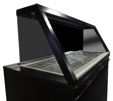 Above: Front view showing fold down sneezeguard in "up" position. Standard black laminate finish.