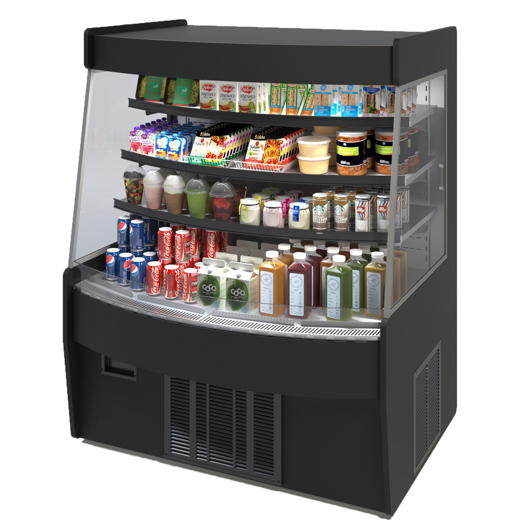 Standard Grab-N-Go merchandisers will be built to the following specifications: The exterior shall be constructed of Matte Black, Moisture Resistant, Rigid PVC Composite Sheets. The interior cavity shall be stainless steel and lit with one top mounted LED light. The Unit shall use a self-contained forced-air refrigeration system and include stainless steel shelves with Black Price Tag Molding. Shelves shall be adjustable to 3 different angled positions. A Digital Refrigeration Control will be mounted in the front panel. Automatic Self Defrost shall be standard.