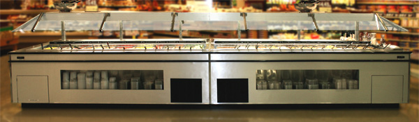 Island Salad bar configured from 2 standard units with lift up glass canopy and optional finishes. The container storage built into the sides is an option.