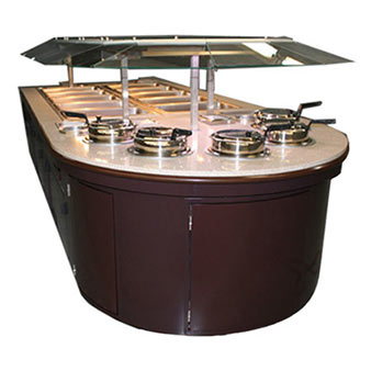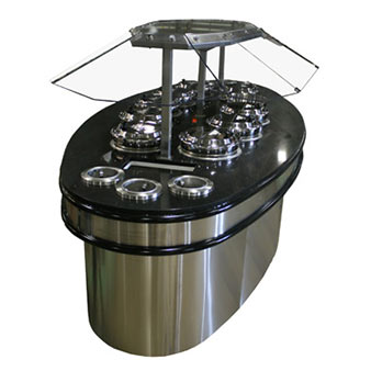 Soup bars are available as stand-alone units (round, or oval) or as end caps (1/2 round or rectangular) in several sizes. Custom finishes, counter tops and configurations are available to build your brand and create ambiance that boosts profits and customer satisfaction.