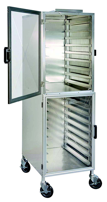 The all-aluminum cabinet is divided into 2 cavities, each with a capacity of 9 full-size sheet pans or 18 half-size pans. The divider panel between the 2 cavities can be removed to make one 18-pan cavity, if desired. The side racks have 3-1/2” spacing between glides, and they are easily removed for cleaning and maintenance. Additionally, lift-off, full-view Lexan® doors close each section and increase flexibility and functionality. Lastly, an adjustable vent on the top of the unit allows you to control the amount of heat and moisture loss to help cool your bread and keep it fresh.